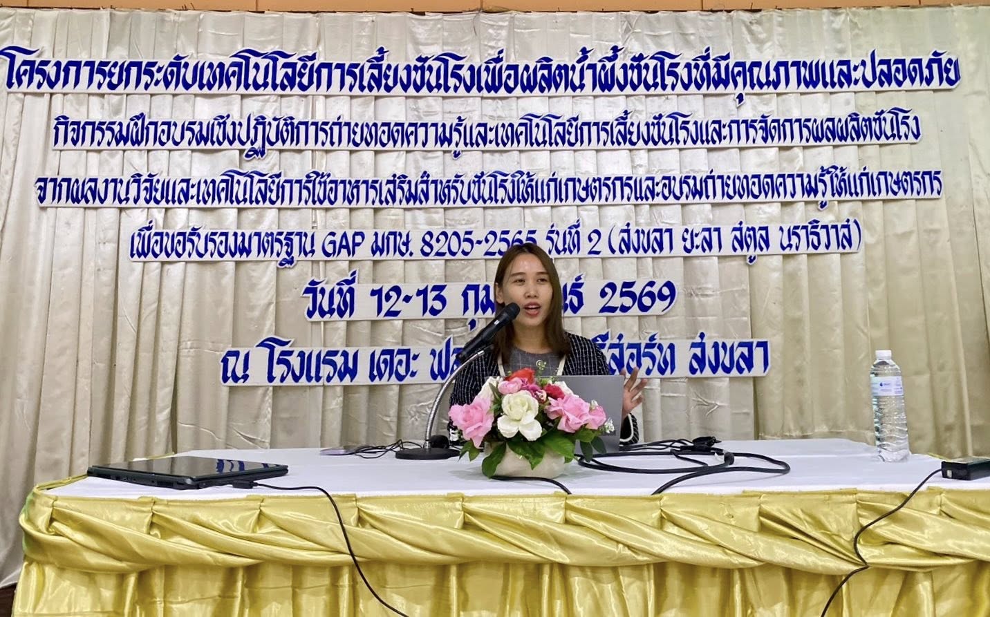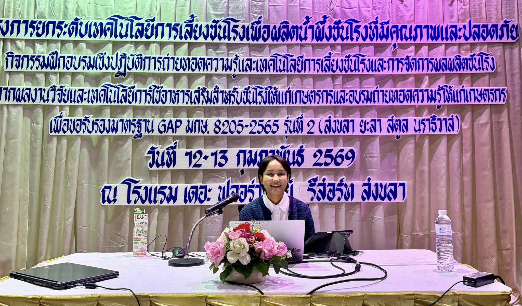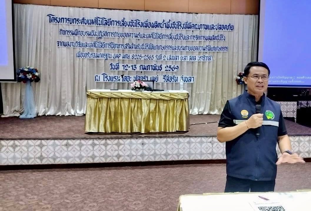 วันศุกร์ ที่ 13 กุมภาพันธ์ 2569 นายสัตวแพทย์ ดร.อนิรุธ เนื่องเม็ก ปศุสัตว์เขต 9 เข้าร่วมฝึกอบรมเชิงปฏิบัติการถ่ายทอดความรู้และเทคโนโลยีการเลี้ยงชันโรง และการจัดการผลผลิตชังโรงจากผลงานวิจัยและเทคโนโลยีฯ พร้อมด้วย สพ.ญ ปิยมล ทวีกุล และ สพ.ญ ทิพพา เชียงสอน ส่วนมาตรฐานการปศุสัตว์ ร่วมเป็นวิทยากรบรรยายหลักสูตร การปฏิบัติทางการเกษตรที่ดีสำหรับฟาร์มผึ้งชันโรง GAP (มกษ. 8205-2565) ณ ห้องประชุม ฟลอร่าแกรนด์บอลรูม โรงแรม เดอะ ฟลอร่า เมย์ รีสอร์ท สงขลา