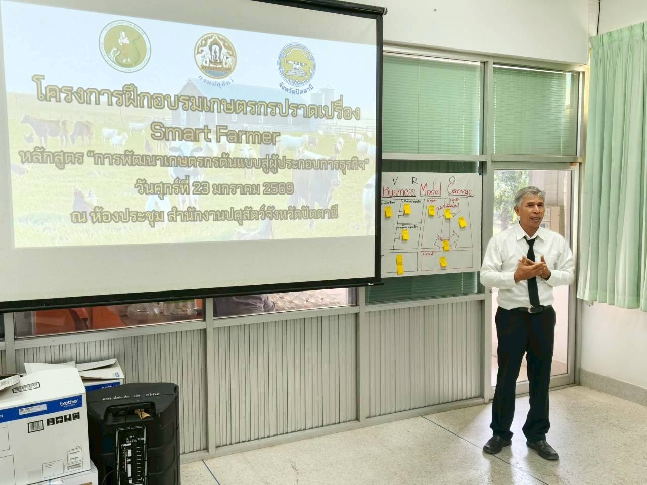 วันศุกร์ที่ 23 มกราคม 2569 นายสัตวแพทย์ ดร.อนิรุธ เนื่องเม็ก ปศุสัตว์เขต 9 มอบหมายให้ นายสุชาติ ตุลยกุล เจ้าพนักงานสัตวบาลอาวุโส ส่วนส่งเสริมและพัฒนาการปศุสัตว์ เป็นวิทยากรอบรมเกษตรกรปราดเปรื่อง (Smart farmer) หลักสูตรพัฒนาเกษตรกรสู่ผู้ประกอบการธุรกิจเกษตร จ.ปัตตานี จำนวน 10 ราย ณ ห้องประชุมสำนักงานปศุสัตว์ จังหวัดปัตตานี อ.เมืองปัตตานี จ.ปัตตานี