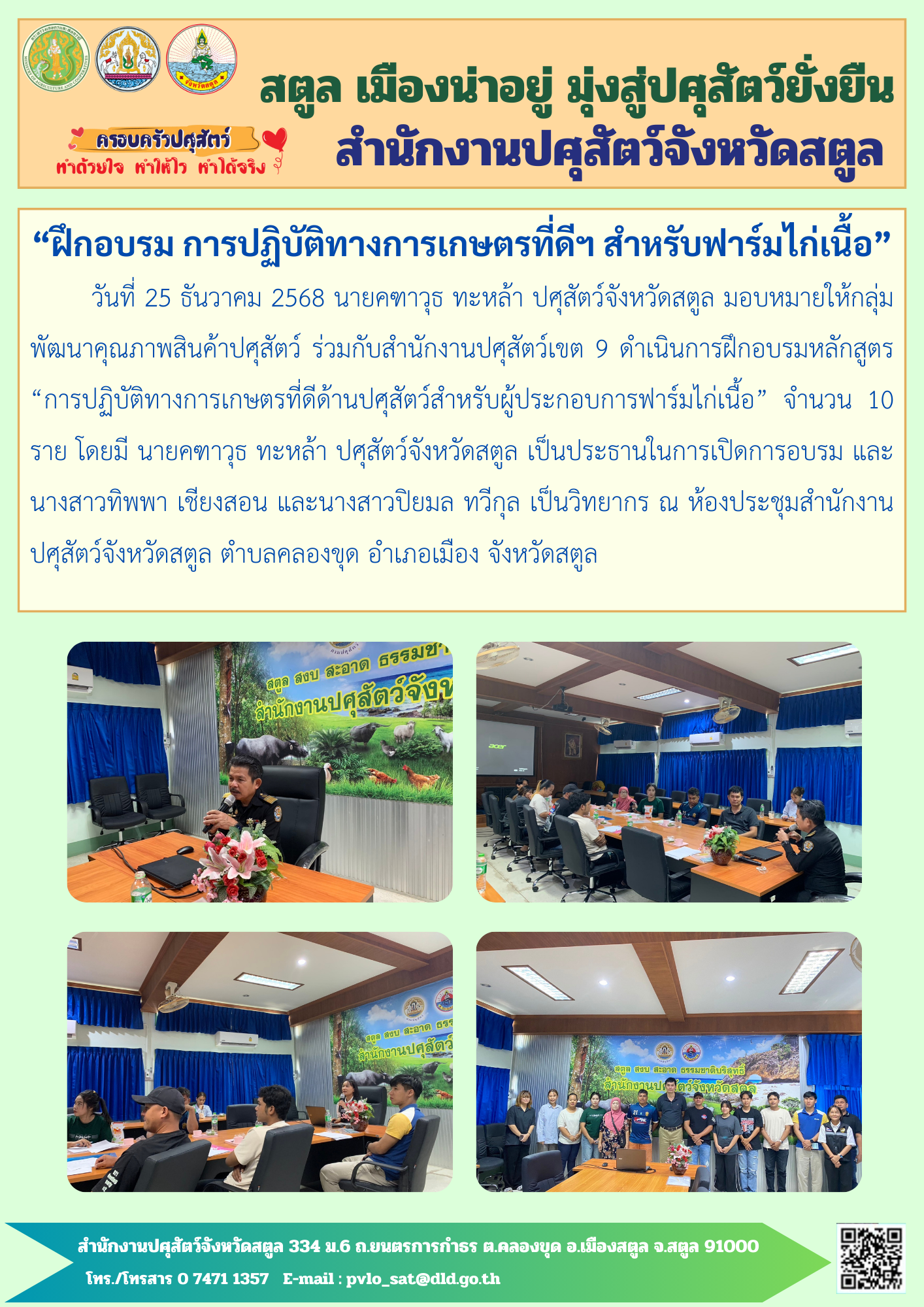 ฝึกอบรมหลักสูตร “การปฏิบัติทางการเกษตรที่ดีด้านปศุสัตว์สำหรับผู้ประกอบการ“ สำหรับฟาร์มไก่เนื้อ