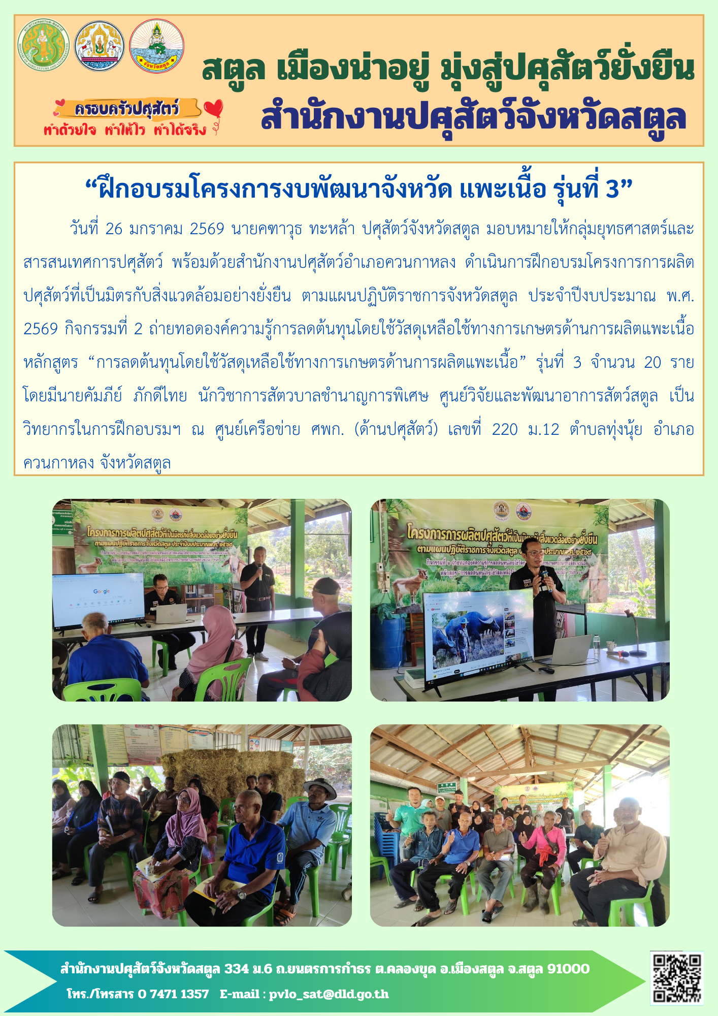เนื้อหาก่อนหน้า: ฝึกอบรมโครงการพัฒนาเกษตรกรรมยั่งยืน กิจกรรมส่งเสริมทฤษฎีใหม่ ก่อนหน้า เนื้อหาถัดไป: ปศุสัตว์จังหวัดสตูล ประชุมข้าราชการ เจ้าหน้าที่ สำนักงานปศุสัตว์จังหวัดสตูล ประจำเดือนมกราคม 2569 ต่อไป