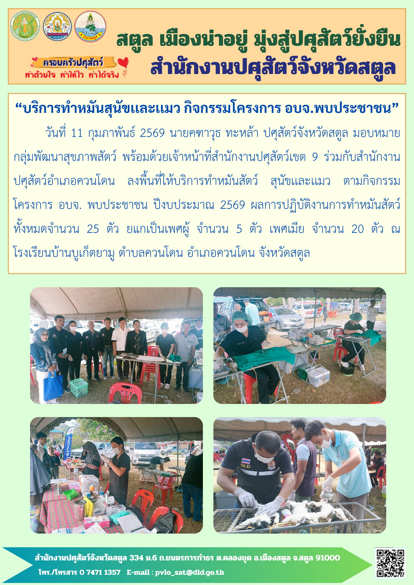 ให้บริการทำหมันสัตว์ สุนัขเเละเเมวกิจกรรมโครงการ อบจ. พบประชาชน ปีงบประมาณ 2569