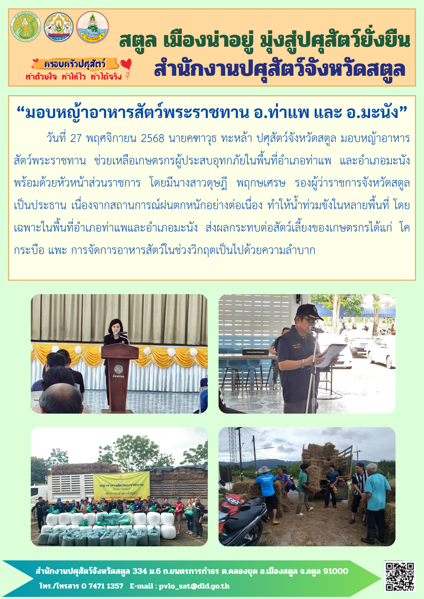 มอบหญ้าอาหารสัตว์พระราชทาน ช่วยเหลือเกษตรกรผู้ประสบอุทกภัยในพื้นที่อำเภอท่าแพ และอำเภอมะนัง