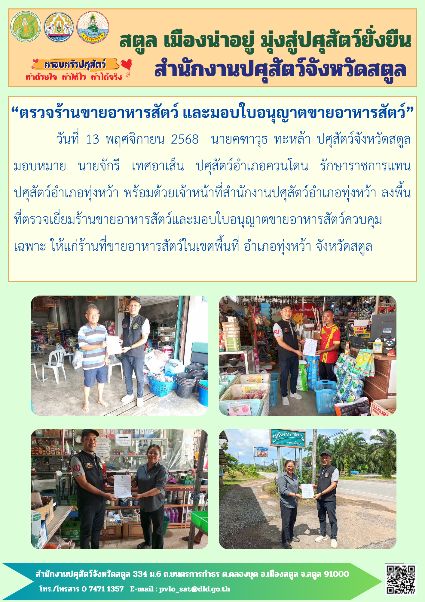 4. ปศุสัตว์อำเภอทุ่งหว้า ตรวจเยี่ยมร้านขายอาหารสัตว์และมอบใบอนุญาตขายอาหารสัตว์ควบคุมเฉพาะ