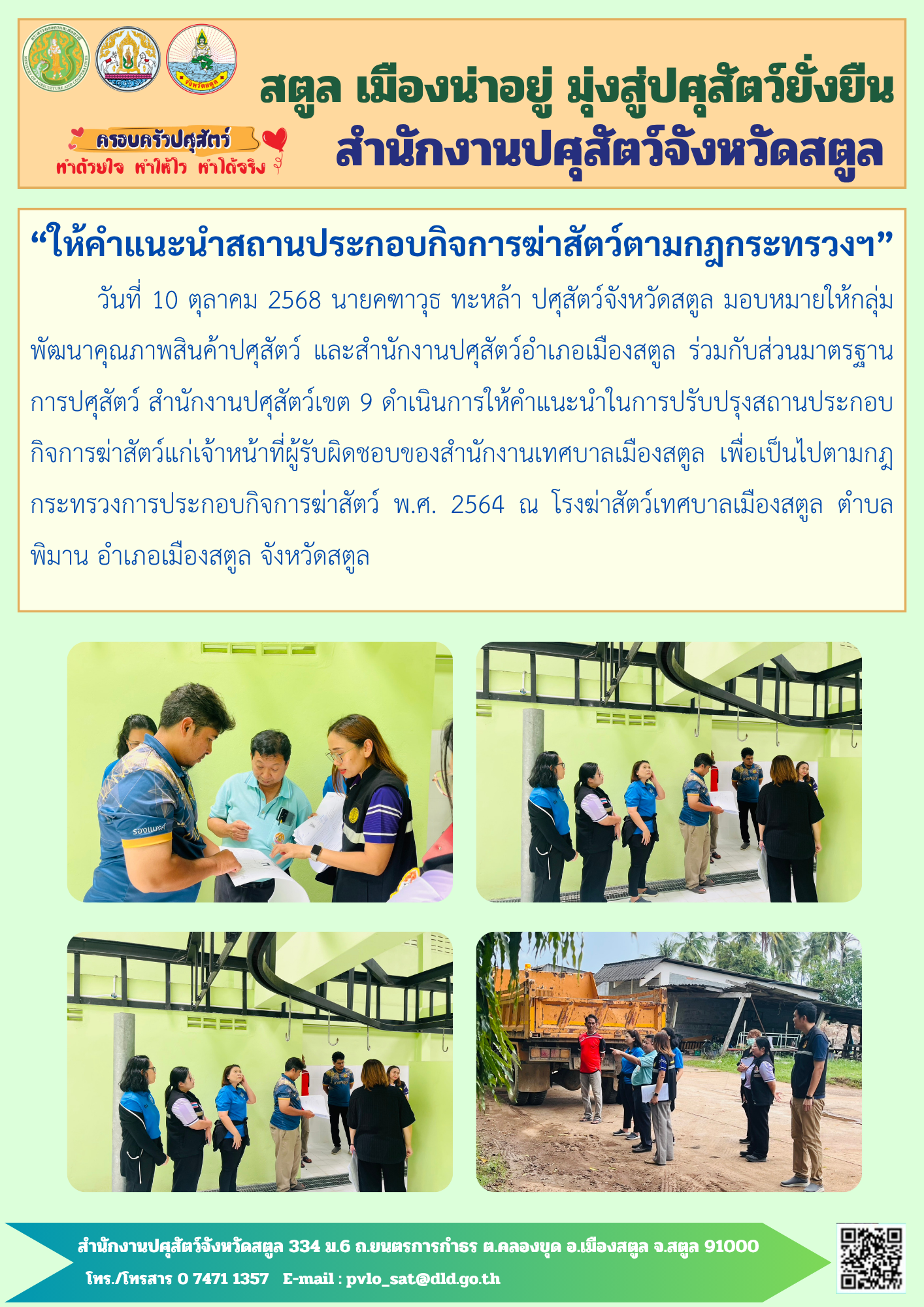 4. สำนักงานปศุสัตว์จังหวัดสตูล ดำเนินการให้คำแนะนำสถานประกอบกิจการฆ่าสัตว์