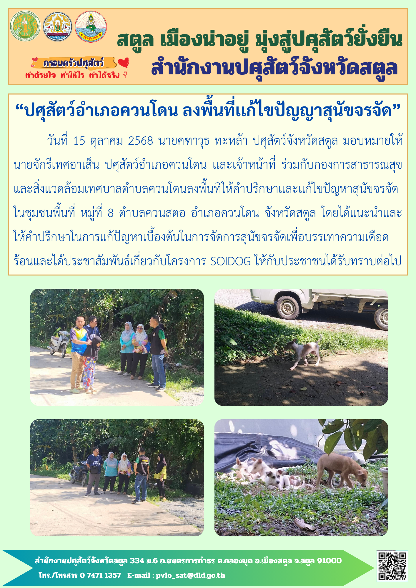 4. สำนักงานปศุสัตว์จังหวัดสตูล ลงพื้นที่ให้คำปรึกษาเเละเเก้ไขปัญญาสุนัขจรจัด
