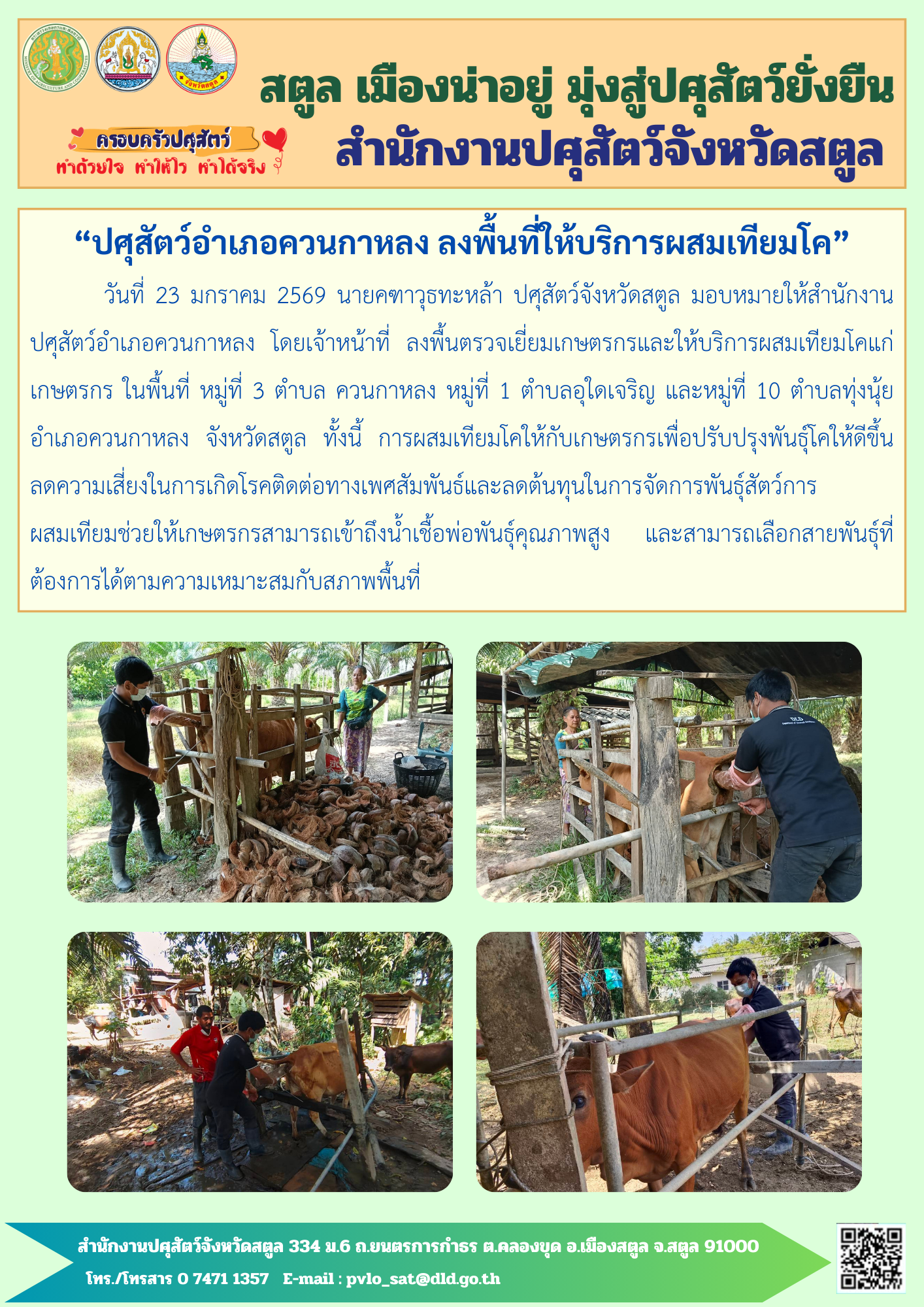 4. สำนักงานปศุสัตว์อำเภอควนกาหลง ลงพื้นที่ให้บริการผสมเทียมโคแก่เกษตรกร
