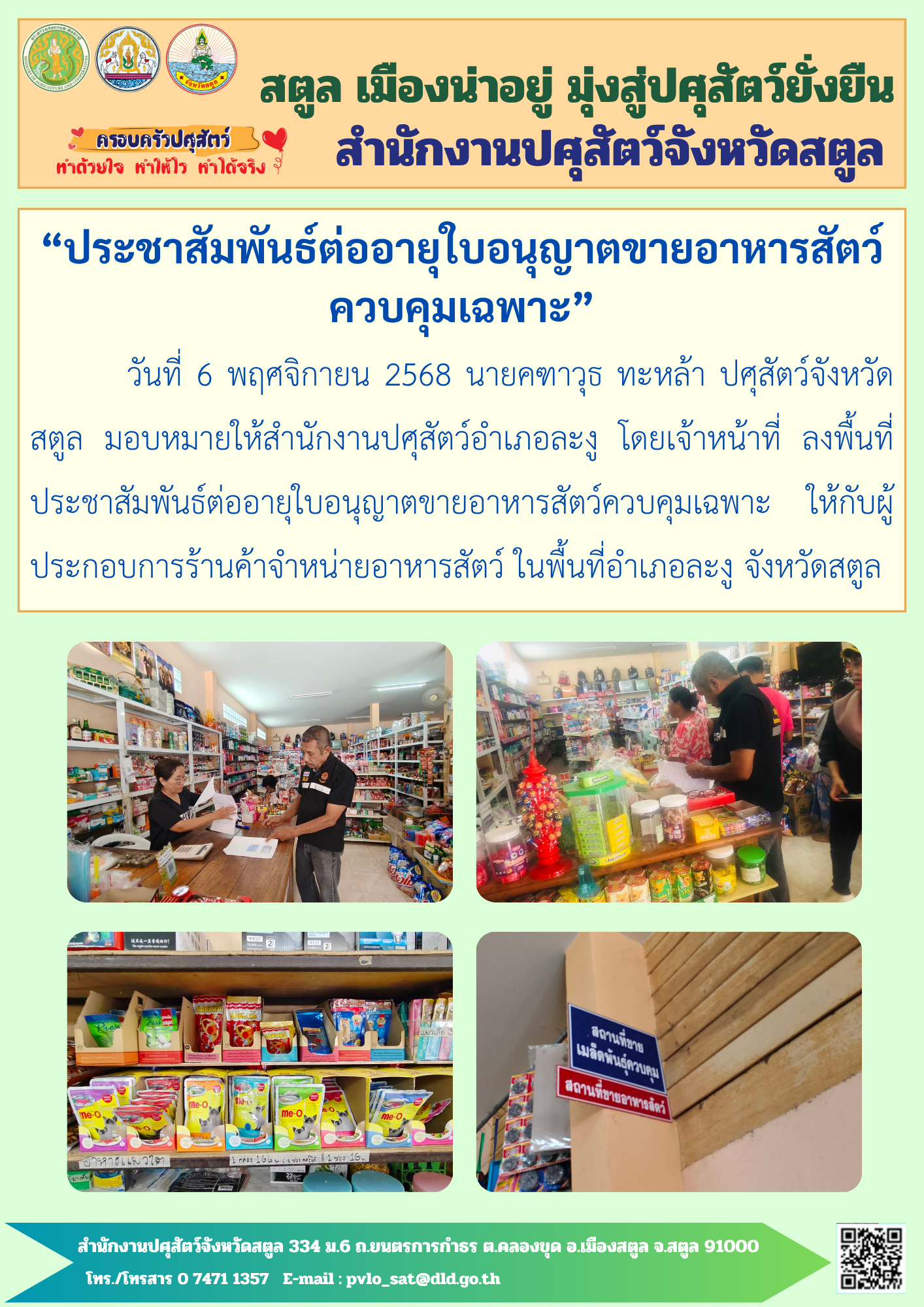 4. สำนักงานปศุสัตว์อำเภอละงู ประชาสัมพันธ์ต่ออายุใบอนุญาตขายอาหารสัตว์ควบคุมเฉพาะ